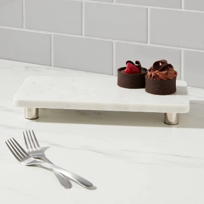 Get a convenient and stylish solution for all your serving needs with this Marble Serving Stand from Threshold™. Crafted from marble in a rectangle shape with slightly curved sides, this serving stand is set atop four silver-tone legs for a simple yet appealing look. This rectangle serving stand offers ample space for your desserts, baked goods, appetizers and more to let you serve friends or family with ease. In white, this serving stand easily mixes with a range of serveware to create an elegant dining set up.