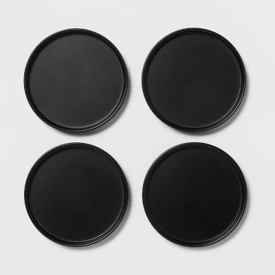 Help your bar counter or dining table from heat and water marks in style with this 4-Pack Metal Coasters with Stand from Threshold™. This set of four metal coasters comes with a convenient coaster holder for easy storage when not in use. Each of the pieces features a classic round shape with a rim detail in a solid black finish that matches any table decor. These sleek drink coasters help protect your tabletop from unnecessary scratches, stains or spills from glasses and cups. Simply wipe clean for easy care.