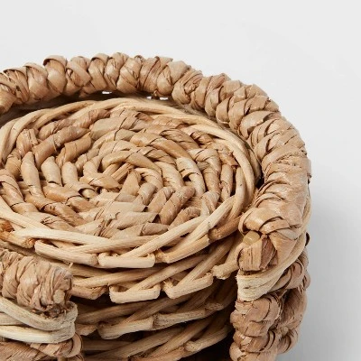 Elevate your kitchen and drinkware with the rustic charm of the Seagrass Coasters with Holder from Threshold™. This pack of table coasters includes four circular coasters featuring a woven seagrass design that will complement any decor aesthetic. They provide a convenient base to rest your drinks upon, keeping tabletops and counters free from messy drips, condensation rings and stains. Plus, the matching holder keeps the coasters neatly stored.