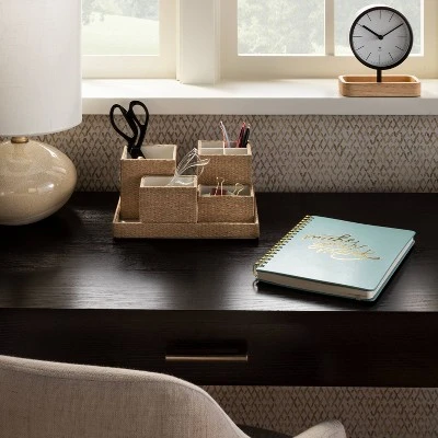 Add an artful piece to your workspace or home decor with the 5-Piece Caddy Set Organizer from Threshold™. This five-piece desk organizer set includes four caddies and a tray that can be used as separate pieces or can be placed in a tray for an organized look. This natural caddy set features a woven-like design to add textured charm to your space.