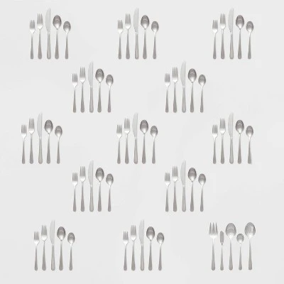 Brighten your place settings with this Stainless Steel Harrington Mirror Silverware Set from Threshold™. This silverware set comes with service for 12, including 12 dinner forks, 12 teaspoons, 12 dinner spoons, 12 salad forks, 12 dinner knives, a serving spoon, a butter knife and more, to meet your serving needs for everyday family dinners or hosting a dinner party. These stainless steel utensils have a mirror finish and modern design that will complement the look of any table setting.