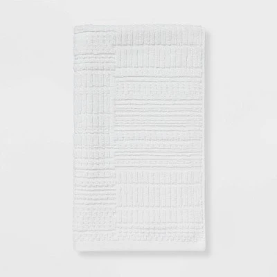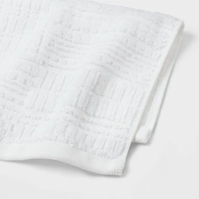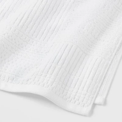 Elevate your bathroom decor with this 6-Piece Modern Towels and Washcloths Set from Threshold™. Made from heavyweight 100% terry cotton fabric, each towel in this set feels soft and allows you to dry off your hands in comfort. This set includes two bath towels, two hand towels, and two washcloths, each featuring a same geometric design on a solid background to add to your modern bathroom aesthetic.