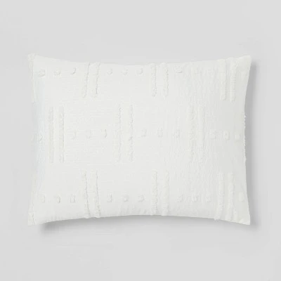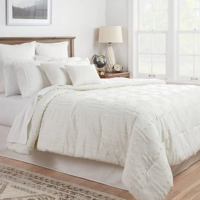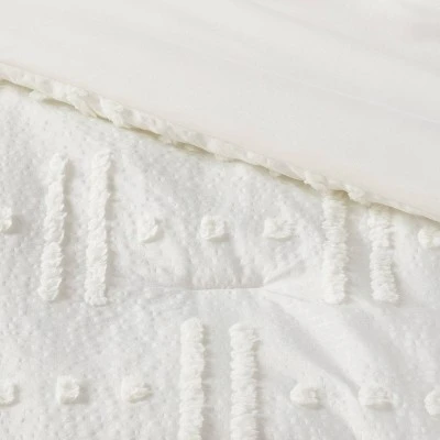 The Lenoir Tufted Broken Stripe Comforter Bedding Set from Threshold™ gives your bedroom a stunning look. The eight-piece bedding set includes a white comforter adorned with broken stripes and dots featuring tufted accents that will add a pop of texture and subtle flair to your space. It comes with shams, decorative pillows and a bedskirt for a complete look. For added convenience, the multi-piece comforter bedding set boasts a lightweight fabric construction that is machine washable.