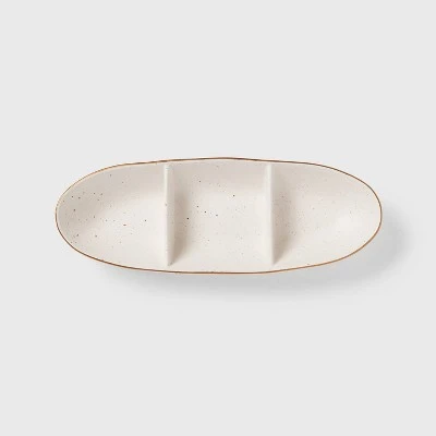 Serve complementary foods together with the Ceramic Sectioned Serving Bowl from Threshold™. This ivory serving bowl features an oval shape with rounded sides for a unique look. The dark brown rim adds to the look, while the speckled hues bring extra visual appeal. It comes with three divided sections to help you serve multiple items in one go while preventing them from mixing with each other. Microwave safe for quick reheating of food, this ceramic serving bowl should be hand washed.