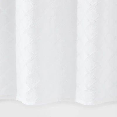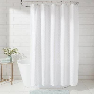 Refresh your bathroom with the clean and classy look of this Dyed Clipped Diamond Shower Curtain from Threshold™. Crafted from 100% cotton fabric, this diamond-patterned shower curtain comes in a neutral white shade with subtle dyed clipped diamond-shaped details for an elegant and spa-worthy textured look. A perfect addition to any bathroom in your home, this white shower curtain comes with a buttonhole top that allows for easy hanging with the hardware of your choice. We’re committed to making products better for you, and the world. This product is Standard 100 by OEKO-TEX certified, meaning that everything from the dyes and fabrics to accessories like buttons and zippers are tested and verified as free from harmful levels of more than 300 substances.