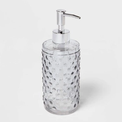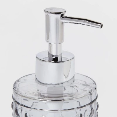 Give your master bath a chic new makeover with this cool and contemporary Hobnail Glass with Plastic Pump Soap/Lotion Dispenser from Threshold™ to dress up your space. Crafted in clear solid glass with a subtle gray tint and an embossed hobnail-pattern allover, this soap dispenser lends effortless style and textured appeal to your countertop. Rounded off with a shiny metal pump to dispense liquid soap or lotion right into your palm, this stunning soap dispenser makes a welcome addition to your counter or vanity.