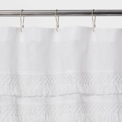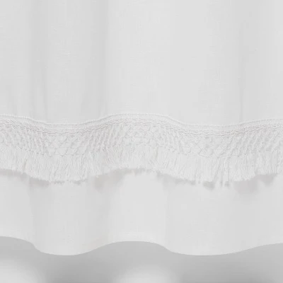 Add pretty texture and style to your bathroom with the Macramé Fringe Shower Curtain from Threshold™. Beautifully decorated with cream macramé detail on the top and bottom, this cream shower curtain will add an eye-catching accent to your space, and it drapes gracefully around your bathtub or shower to offer ample privacy. This cotton shower curtain comes finished with a buttonhole top that allows for easy installation — all you need is a set of curtain hooks or rings.
