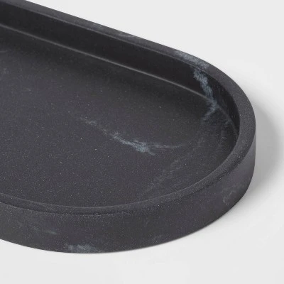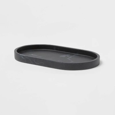 Flaunt a modern bath space with the Marble Bath Tray from Threshold™. This black bath tray is designed in a rectangle shape with rounded corners and raised sides, and features a touch of speckled white hues for an appealing look. Place this marble tray on the counter to keep everything in one spot and add a coordinating marble soap dispenser and soap dish to complete the look of your bath space.