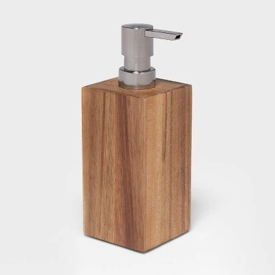 Refresh your bathroom space with the warm, rustic ambiance of this natural wood-tone Medium Acacia Soap Pump from Threshold™. Crafted from lovely acacia wood, this soap dispenser sports a grainy wood finish for an attractive natural appeal while the clean lines and simple design add a chic, minimalist vibe to your space. Topped off with a brushed metal pump that provides attractive contrast and easy dispensing, this handy soap dispenser makes a welcome addition to your bath collection. Style it with coordinating bath accessories for a spa-worthy collection you’ll love to flaunt.
