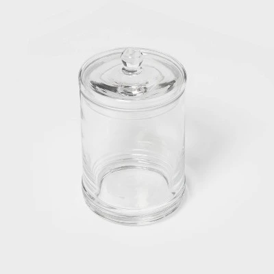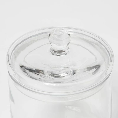 Bring sleek storage to your bathroom countertop with the Medium Glass Apothecary Canister from Threshold™. This clear round glass canister comes with a lid, keeping whatever you stash inside protected from moisture and dust. The rounded glass knob on the lid makes it easy to take on and off, and the clear glass construction lets you see what you’ve stored inside and blends in easily with your existing bathroom decor. It’s perfect for storing and organizing cotton swabs, cotton balls, bandages and any other small items.