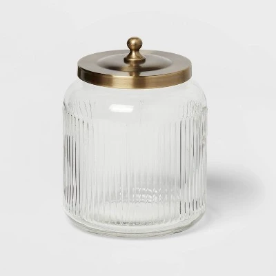You’re sure to love the functional style this Medium Glass Bath Canister from Threshold™ brings to your bathroom decor. This glass bath canister comes in handy for storing small makeup or grooming tools, accessories, cotton balls and more. Best of all, it comes with a lid to help keep the contents safe. Featuring a clear glass design with a ribbed exterior and a brass lid, it adds classic style to your bathroom decor.