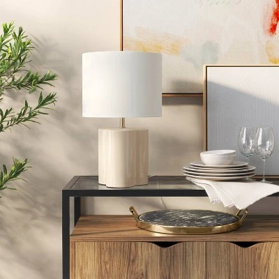 Enhance your indoor lighting with this Modern Clover Table Lamp from Threshold™. This table lamp features a cream ceramic base with a clover shape for unique modern flair. The white linen drum shade completes the crisp look, while the on/off light setting with a rotary socket switch allows for easy functionality. Place it on any side table, console or sideboard for stylish, warm lighting.