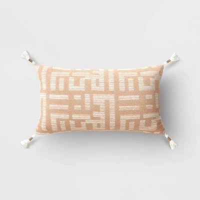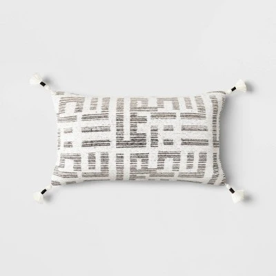 Make over your bedroom or living space with the contemporary charm of this Oversized Modern Geometric Patterned Lumbar Throw Pillow from Threshold™. Made of 100% cotton with soft filling, the rectangle throw pillow is adorned with an abstract geometrical pattern and features matching tasseled corners for a fun look. Whether you lounge in your favorite recliner, read a book on the couch or watch TV curled up on your sofa, you’ll love leaning on this oversized lumbar pillow.