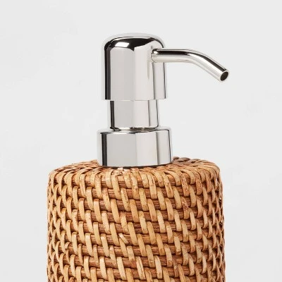 Bring natural appeal to your bathroom decor with this Rattan Soap Pump from Threshold™. This rattan soap pump features a cylindrical shape in a natural brown woven finish for textured appeal that blends with any bathroom decor. It comes with a metal top pump that dispenses just the right amount of gel soap or lotion without any waste. Coordinate with a matching tray and bathroom canister for a cohesive look, and simply spot clean as needed.