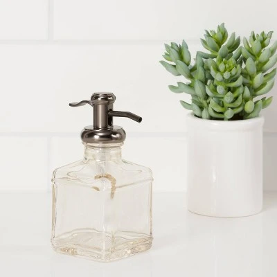 - Antiqued bath coordinates include tall and short soap dispensers and a glass canister