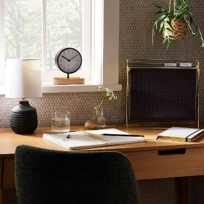 Keep your workspace modern and updated with the Tabletop Hanging File Holder Gold from Threshold™. This hanging file holder features a black color with gold-tone metal frame for a beautiful contrast and an eye-catching look. Place this metal-frame hanging file holder on a desktop or tabletop to keep your files organized and within reach.