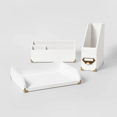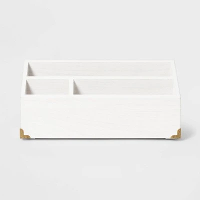 A straightforward approach to tabletop organization, the Wood Desktop Storage Unit from Threshold™ makes a functional addition to your desk. The natural wood design and dovetail joints make for a modern update on office style. The white wood desktop storage unit is made up of three different compartments that are ideal for pens, notebooks, mail or anything else you need to keep in one place, and works well with a variety of decor styles.